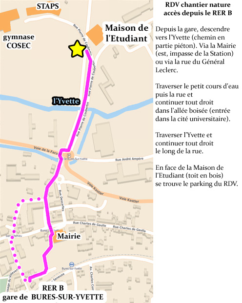 Le lieu de RDV est fixé aux horaires de début de chantier sur le parking près de la Maison de l'Etudiant ou Maison des Paris-Sudiens (bâtiment avec un toit en bois gris anguleux), côté ouest (barrière rouge et blanche au-dessus de l'entrée du parking).